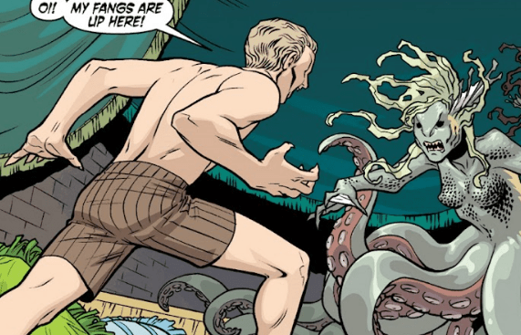 One of the Sirens turns to the Mistress, delighted with what they’ve done. But the Mistress is horrified, squelching and screaming from her slimy throne. She yells at Thelma – if the vampire can hear then they’ve lost their control!