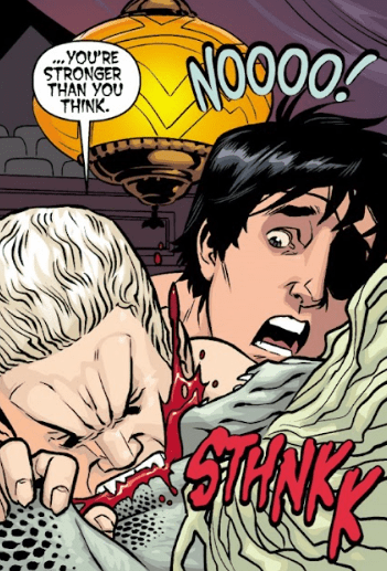 His voice is raw, the kind that’s been holding back too much for too long. He steps forward, jabbing a finger toward Spike. “You are so full of crap! A blind man could see you’re not even close to being over Buffy! The only one you’re fooling is yourself… AND YOU EVEN SUCK AT THAT!”
