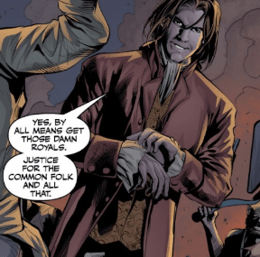 He heads through the din, walking calmly. And as he walks, Angelus mocks the humans around him. “Yes, by all means, get those damn royals. Justice for the common folk and all that.”