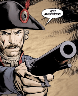 He turns when he hears a noise. It’s a Royalist, shouting at him, musket in his hand. “You monster!”