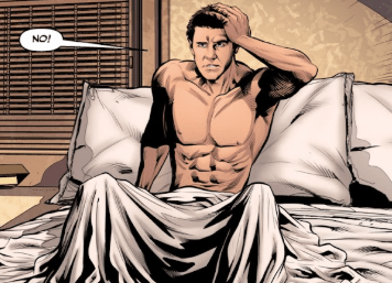 Angel awakes with a start and a scream, the third, maybe fourth nightmare this week. But that one was different. That wasn’t Angelus. That was him. He throws the cover off himself and sits on the edge of the bed. He’s rattled.