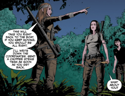 “Okay, we’ve found the path back to the river. This will take you right back to the boat. If you keep moving, you should be all right. I’ll write down the coordinates. Send a chopper strike team as soon as you get back.”