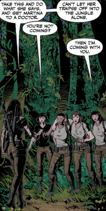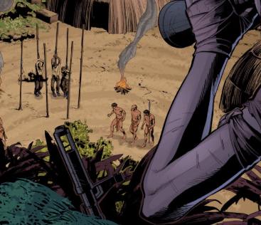 In the South American jungle, the troop have stopped, resting while they have the chance. Sam has taken command expertly. “Okay, rest easy while you can, people. It’ll be daylight soon. The vampire village is that way.”