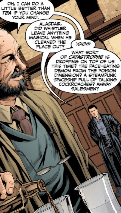 In London, at a large townhouse, Alasdair Coames is delighted by the visitor who has come to call. “Angel. What a pleasant surprise!” He raises his arms in welcome, but then drops them after seeing Angel’s tired face. “But something tells me this isn’t a social call.”