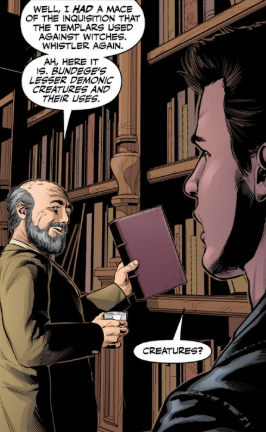 Alasdair slides down the ladder like a teenager, his face excited. He’s glad to help. “Well, I had a mace of the inquisition that the Templars used against witches. Whistler again.” He opens the book to Angel. “Ah. Here it is. ‘Bundege’s Lesser Demonic Creatures and their Uses.’”