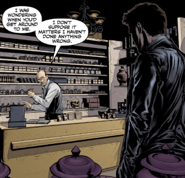 He goes through the front door of the shop, an old-fashioned bell ringing as he enters. The Pharmacist is behind the counter. He’s a balding, middle-aged man, one of those types that’s run the business for years, kept it in the family. There’s nothing particularly special about the guy, but when he spots the vampire come in, Angel can sense the man’s fear – and his barriers going up.