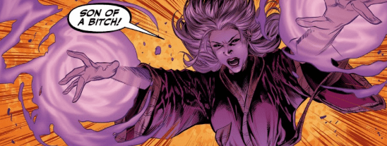 “Son of a bitch!” she yells and she’s engulfed instantly in a purple light. It comes from her hands and the air around her moves, swirling like smoke.