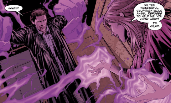 “So the wonderful, self-righteous Angel refuses to help me? You know what? I’m glad. So much better this way.” Amy has a huge grin of satisfaction on her face as she looks up at her prisoner. The purple glow around her just heightens how unhinged she looks, standing there, power crackling.