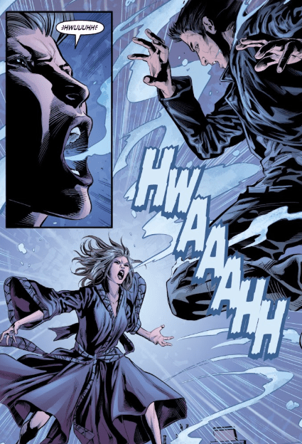When he rights himself up again, Angel is glowing with blue energy and, as he looks over to Amy, she’s conjuring a blade, from the same energy, into her hands.