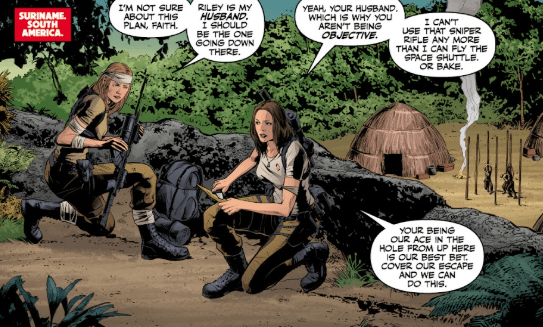 Within minutes, Sam screams Riley’s name, completely shedding her professional soldier behaviour that she’s cultivated all the way through the mission. Riley reaches her and they reunite with a kiss, a kiss that goes on too long for Faith’s liking. She smiles as she tells them to knock it off.