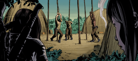 Then, from the ridge above the ruins, there’s movement. Sam calls to them. “We’ve got company. Lots of it.” The tribal vampires are back, and in force this time, lining at the top of the ridge, looking down at the small space the team has inadvertently walked into.