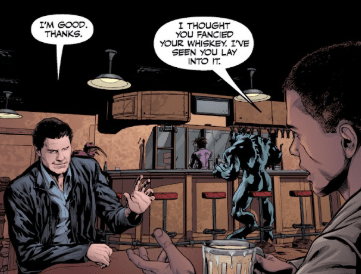 Elsewhere, across the Atlantic, Angel is once again in Rory’s bar. This time, however, he’s actually arranged an appointment. As he sits there, notably without a drink this time, he hears a voice behind him, as the chair opposite him scrapes out on the wooden floor and is filled.