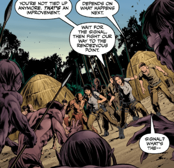 In the jungle, surrounded by tribal vampires, Riley turns to his saviours with no small amount of sarcasm. “This is not good.”