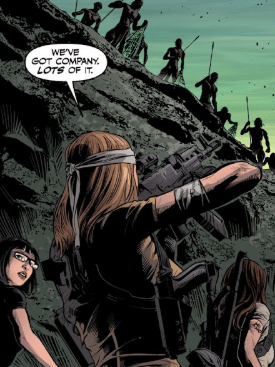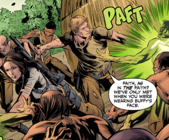 On the ridge, Samantha Finn is moving like a robot. She doesn’t take her eyes from her scope and recharges fluidly. She lays down cover for the group as they scatter to exit the camp. As Riley stakes a vampire, and wonders why they’re in sunlight, he thinks better of asking questions, but does turn to Faith. “Faith. As in the Faith? We’ve only met when you were wearing Buffy’s face.”