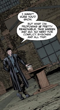 In Corky’s former warehouse, with nothing but a table in the centre of the large space, Angel waits. He puts his hand on the jar, and then he senses Amy before he can see her. The magic gives off a specific scent. “I wasn’t sure you’d show. But what I’m proposing is pretty reasonable. Take Warren and go. No need for conflict. Bygones and all that.”