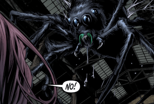 Suddenly, as Amy looks up, her face is cast in shadow by the demon above her. It’s like a spider, but huge, it’s eyes blinking at the witch as if she were a fly caught in his web. She screams in fright, but then composes herself, unleashing magic from her hands, created by the bottle she’s pulled from her bag.