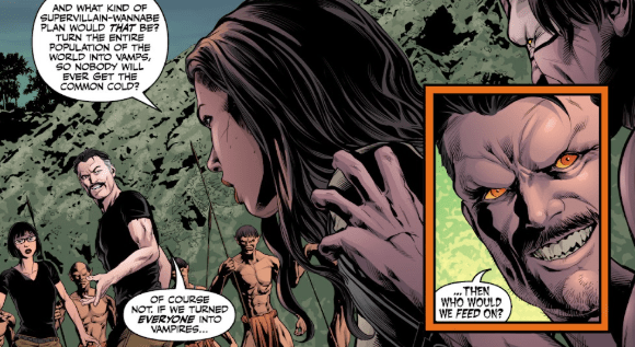 As she finishes her rant, Walt turns to her and morphs his face in the process. “Of course not,” he grins at her. “If we turned everyone into vampires, then what would we feed on?”