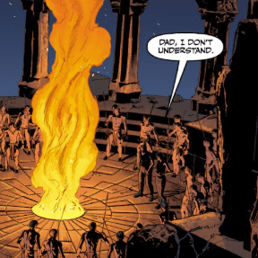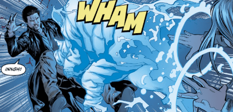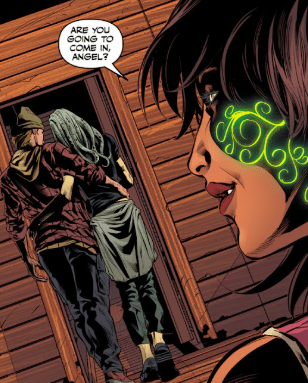 Pulling himself from the ground and grunting in the process, Angel turns to Amy and looks her in the face. He once more tries to dissuade her from these actions. “You do need it, Amy. Or at least, you need my advice. The fact that you’re getting so powerful, so quickly is why you need to slow down. Because it will never be enough and you’ll destroy yourself wanting more and more. But if you’re not going to listen to reason, I’ll have to knock some into you.”