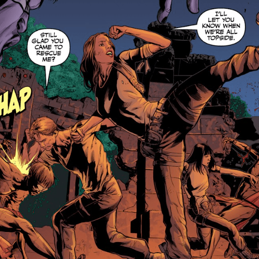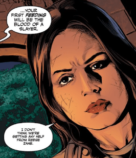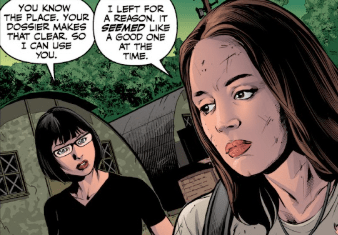 Reese doesn’t look back at Faith. She stares out of the chopper, over the jungle they’ve just survived. When she does turn, her voice is low, and Faith knows the weight she’s feeling. “Whoever it was that I killed, he wasn’t my father anymore,” she says to the Slayer, before resuming her silent stare at the rapidly disappearing greenery.