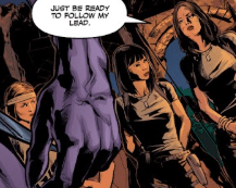 Faith looks at them all, one by one, making sure they all know what she’s thinking. She hasn’t got a plan, but looks beyond the stone circle, into the jungle. “The plan is sort of a work in progress,” she admits, but then quickly follows with another command. “Just be ready to follow my lead.”