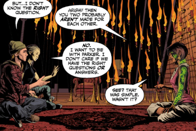 Parker shakes his head. He doesn’t know the question, which was kind of his point. Nadira sighs, tells him that they probably aren’t meant to be together. Tricia insists that she wants to be with Parker: she doesn’t care one bit. Nadira smiles at them now and tells them, still with her eyes closed, that that wasn’t difficult at all.