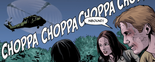They’re interrupted by a familiar and wonderful sound: a US military chopper, with Martina and Sarah onboard, is approaching them fast. Riley yells incoming and as the chopper comes around, Sarah helps them aboard.