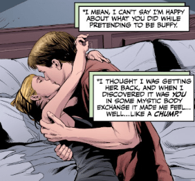 He looks up at her, into her eyes and smiles. “Faith, I’ve got no problem accepting your apology. Least I can do after you saved my butt. I mean, I can’t say I’m happy about what you did while pretending to be Buffy. I thought I was getting her back, and when I discovered it was you, in some mystic body exchange, it made me feel… well… like a chump.”