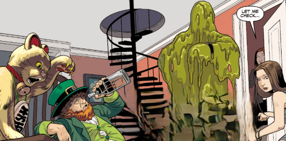 “The leprechaun’s drunk. At eight a.m. He’s annoyed the Lucky Cat into a murderous rage. And Dawn’s running out of pots and pans to put under Cedric the Slime Man.”