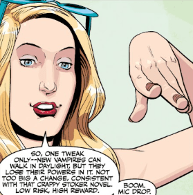 So Harmony reveals her plan. “So, one tweak only. The new vampires can walk in daylight, but they lose their powers in it. Not too big a change, consistent with that crappy Stoker novel. Low risk, high reward.”