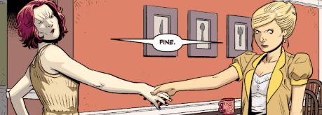 Buffy can take no more. Fighting the urge to yell, she clenches her fists and turns her back on everyone, walking to the safety of her couch. “Can everyone get out of my house, please?”