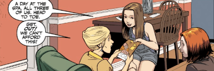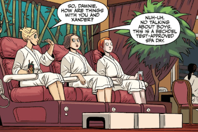 Dawn is calm and relaxed. And then, just as silence settles in the room, Buffy asks about Xander. Dawn’s reaction is immediate. “No talking about boys. This is a Bechdel test-approved spa day.”