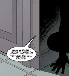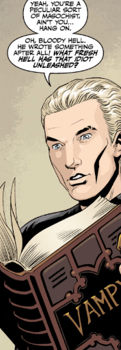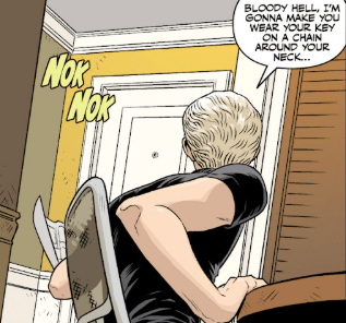 Turning to a page at the back of the book, Spike sees that Clem did indeed create a rule on an obscure page. “Oh, bloody Hell. He wrote something after all! What fresh Hell has that idiot unleashed?”