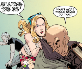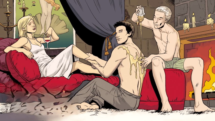 She turns, bends over and points at her posterior. When he doesn’t move, she turns to look at Spike, who’s standing there, grin plastered on his face. Then, Harmony turns to Clem, who’s managed to put at least three chairs and the dining table between them.