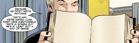 Spike chuckles and then opens the book wide. The pages are blank. “Because he didn’t write anything. That’s why we’re mates. Clem might have questionable taste in women, but he’s at least got a whit of sense.”