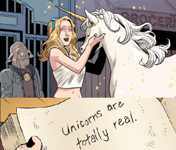 “Clem, you bloody softy,” Spike says as he sees the words ‘UNICORNS ARE TOTALLY REAL’ scribbled quickly. Spike laughs. “Well, I reckon the world will survive. Wish it was always that easy.”