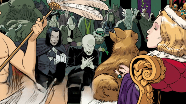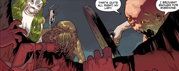 It’s the Soul Glutton. And he’s talking with the Mistress, who’s chewing her food, relishing it. “I do appreciate the refreshments,” she says, burping loudly. “Oh, excuse me… and the need to put aside our differences in the face of the Slayer possessing the means to shape magic itself. But even working together, we have no hope of beating her and our old rival.”