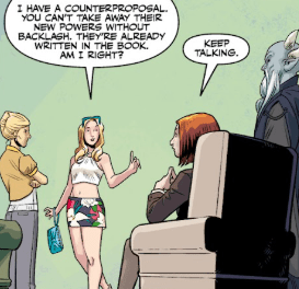Harmony automatically heads into the centre of the room, everyone else gathered around her. Her voice is still screechy, but, thankfully, she’s quick to the point. “So, conflict between your people and mine. I’m here to resolve it non-violently. I’m all about the peace. Like Gumby.”