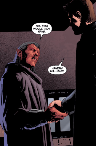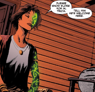 In Nadira’s back room, Eldre Koh is explaining his past and his feelings to the guru, finding it surprisingly easy to talk to her. “For so long, I’ve allowed myself to feel only a burning need for revenge. To think of hatred as righteous wrath. To pretend retribution was the same as justice. I have been deceiving myself.”