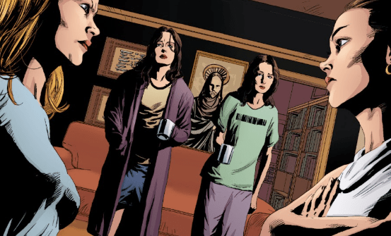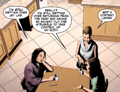 At the breakfast table, Faith has yet another coffee poured by Lavinia, who’s also bringing more fresh toast. The Slayer yawns. “I’m still getting over jet-lag.”