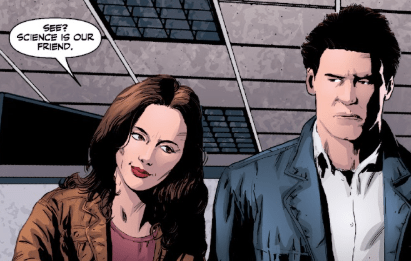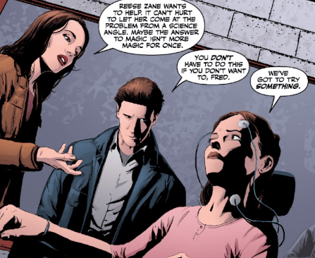 Hours later, at the newly opened labs of Zane Pharmaceuticals. Angel has come here, with Faith and Fred. Angel and Faith watch as Fred sits on a chair. Doctors hover around them, preparing their tests as Reese Zane coordinates. Angel has reservations. “I’m not sure about this, Faith.”