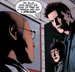 Angel turns, annoyed at the doctor. “Dr. Ellis, how about we think of Fred as a person and not a specimen.”