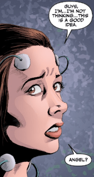 From inside the chamber, over the intercom, Fred’s voice comes through, loud and clear. “It’s okay, Angel. I get what they’re doing. When I was Head Science Geek at Wolfram & Hart, the first step was always information gathering. Can’t form a hypothesis without data, right?”