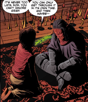 Nadira comes close to him, placing her hand, the green markings shining, on his shoulder. “It’s never too late, Koh. You can’t ignore grief. You can only get through it in its own time. And then maybe…”
