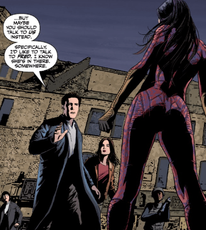 Angel’s voice attracts her attention. “I hate to interrupt you when you’re talking to yourself, but maybe you should talk to us instead. Specifically, I’d like to talk to Fred. I know she’s in there somewhere.”
