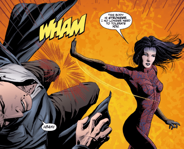 She swats Angel aside with her hand, sending him flying to one side. “This body is stronger. I no longer need tolerate you.“