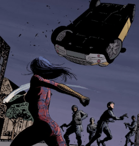 The car’s bonnet crumbles like paper in Illyria’s hands and she launches it straight into the air, right at the Zane guards. They scatter just in time to avoid being crushed.