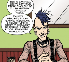 “This is San Fran, right? Let your freak flag fly. So, I’ll be straight up. I’m a freak. I’m into S&M, B&D, role-playing, polyamory… I figure life is short. It shouldn’t be boring. I crave action, adventure. Stimulation!”