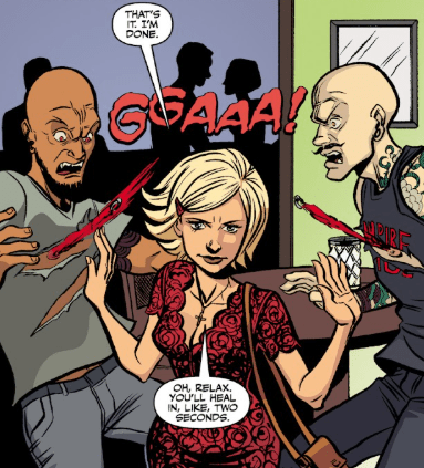 With that, Buffy Summers has enough and walks through the vampires, causing them to scream as their piercings rip through their flesh. As they both scream, like little girls, Buffy waves her hands at them. “Oh, relax. You’ll heal in like, two seconds. And for future reference, I like my vampires with a little more soul and a little less Portlandia.”