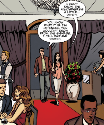 Minutes later, they’re entering a rather exquisite restaurant, with servers moving around with trays and extravagant furnishings. Dawn stops as they walk through the threshold. “I don’t know. The atmosphere’s a little datey,” she worries. Xander makes a joke. “You wouldn’t know from the signage. I call bait and switch.”