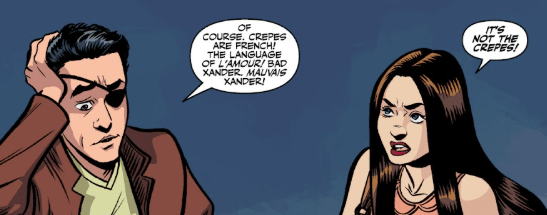 Xander rubs the back of his head, but instantly reverts to jokes. “Of course. Crepes are French. The language of L’Amour! Bad Xander. Mauvais Xander.”
